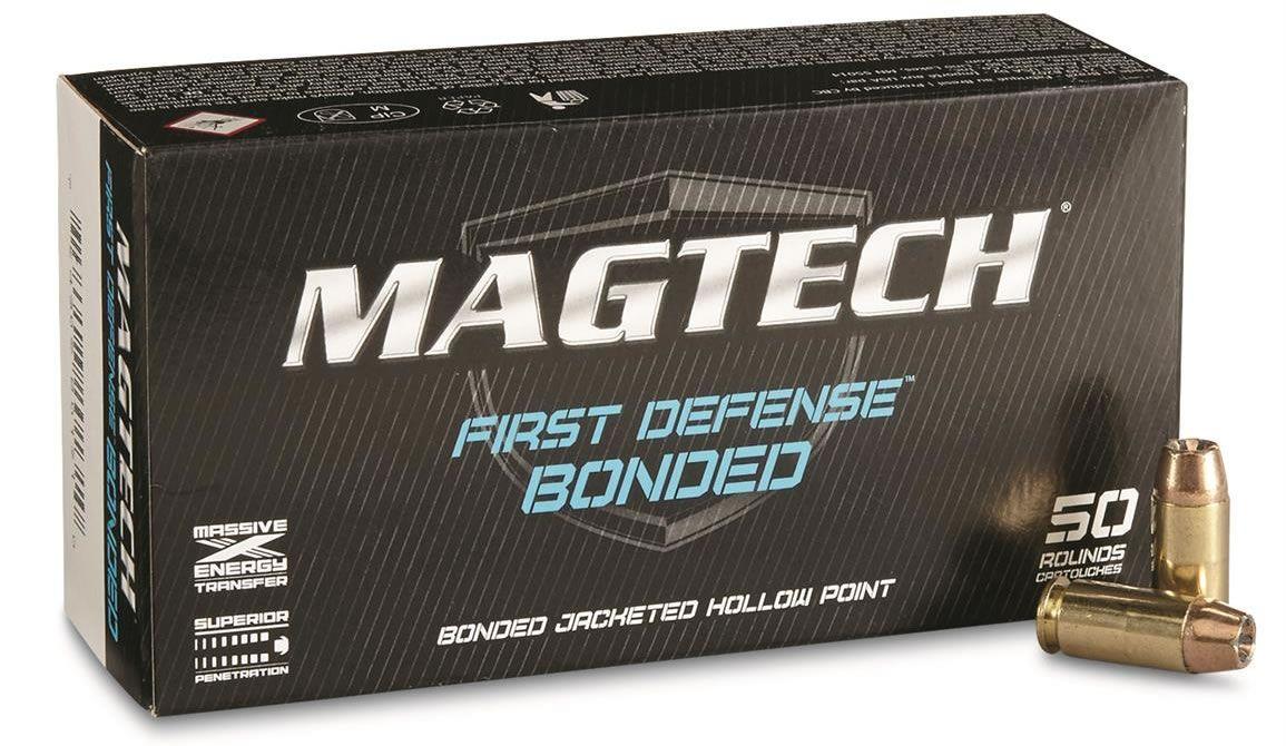 Munición calibre .40 SW. Serie First Defense Bonded. Tipo de punta JHP (Jacketed Hollow Point). De 180 grains. Caja de 50 unidades.