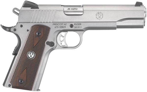 Pistola Ruger modelo SR1911. Calibre .45 ACP. Semiautomática. Corredera acero inoxidable. Cañón de 5 pulgadas. Capacidad de 8+1 disparos. Aparato de puntería tipo Novak. Con 2 cargadores.
