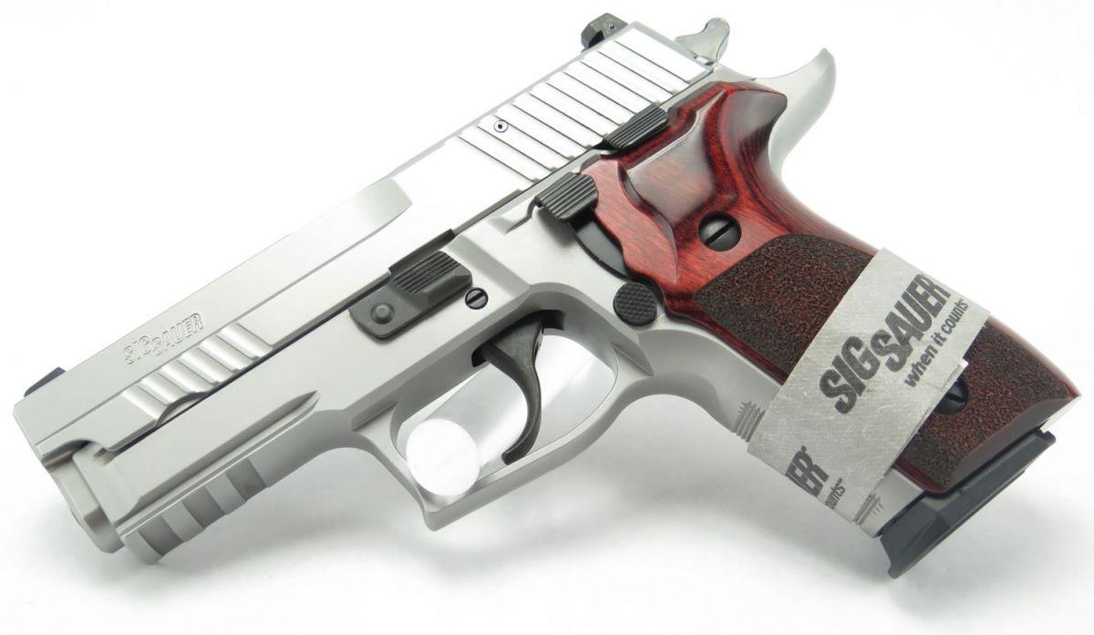 Pistola Compacta. Calibre 9 mm. Capacidad de 15+1. Simple y doble acción. Armazón y corredera de acero inoxidable. Con 3 cargadores. Grip de madera. Largo total: 18 cm. Alto: 13,72 cm. Cañón de 9,91 cm. Mira SigLite Night Sights. Peso con cargador: 975 gramos.